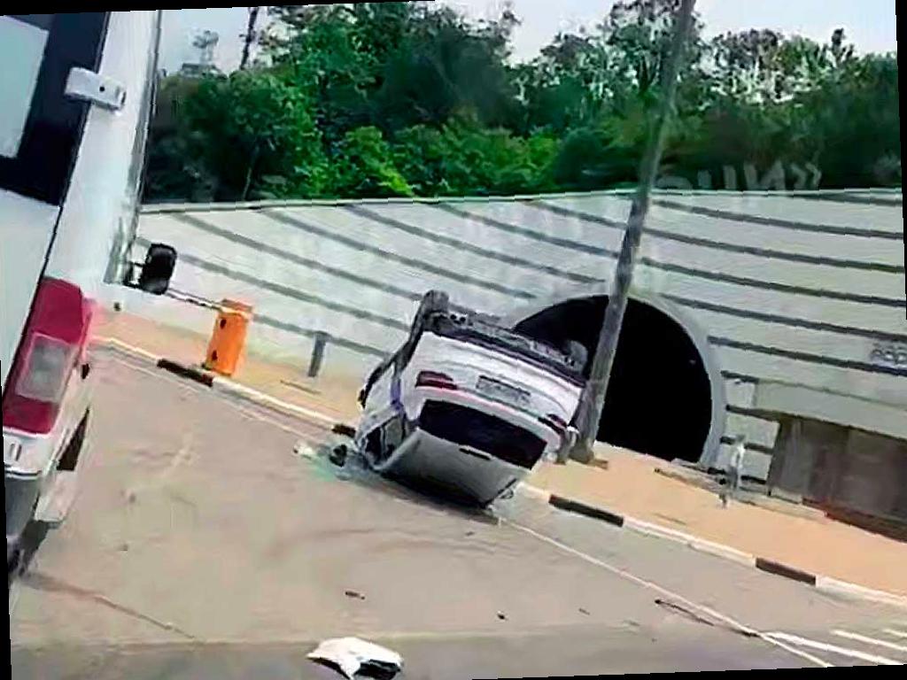 Транспортное средство лежит на крыше у въезда в тоннель, что привело к образованию пробки. Пока неизвестно, что стало причиной этого происшествия.