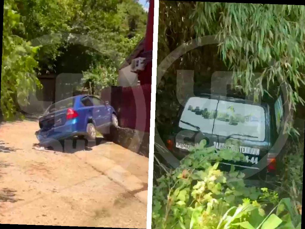По всей видимости, после столкновения угонщик потерял управление и ушел в кювет — внедорожник остановился в кустах неподалеку от поврежденного автомобиля.