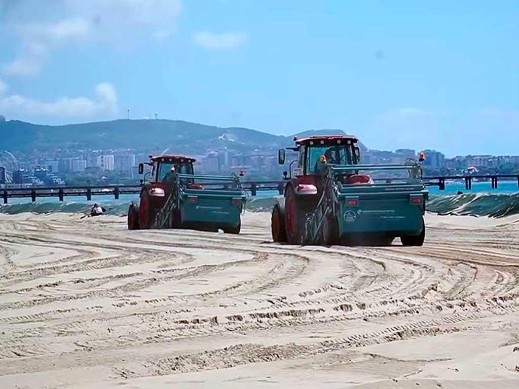 Для выполнения работ задействованы два больших и два малых МТЗ, а также пляжеуборочная машина с сетками различного размера ячеек. Техника работает по 8 часов в день, планируется завершить уборку этого участка за четыре суток.